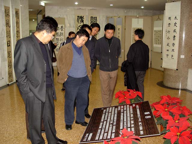 校领导在欣赏各类书画作品。