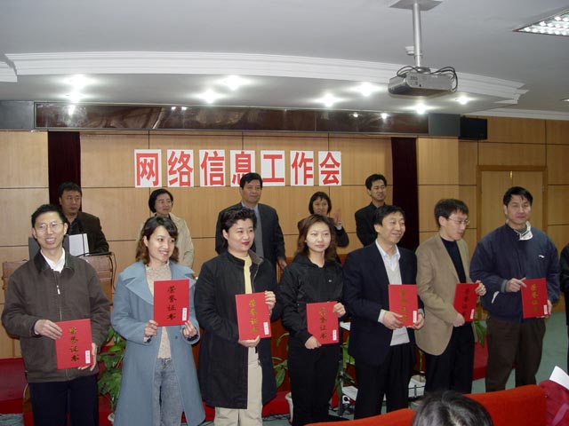 现代教育技术与网络信息中心副主任赵敬中宣布了2004年网络信息工作优秀单位,宣传部、校团委、学生工作处、招生就业工作处、机电工程学院、管理与经济学院、继续教育暨远程教育学院等七个单位获此殊荣。侯光明副校长对获奖单位颁发了获奖证书。