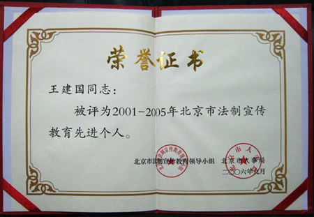 我校在“四五”普法期间开展了大量富有成效的法制宣传教育活动。学校法律事务室王建国同志被评为“2001-2005年北京市法制宣传教育先进个人”。