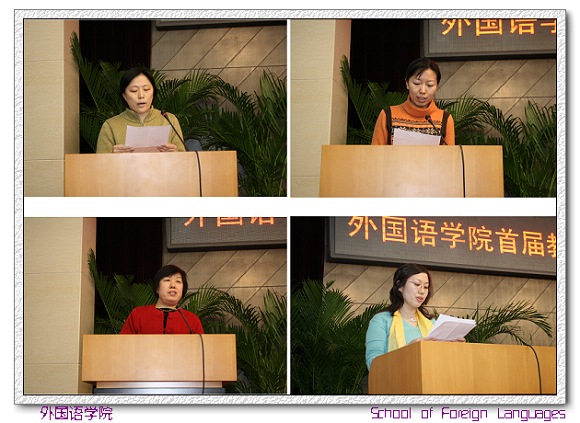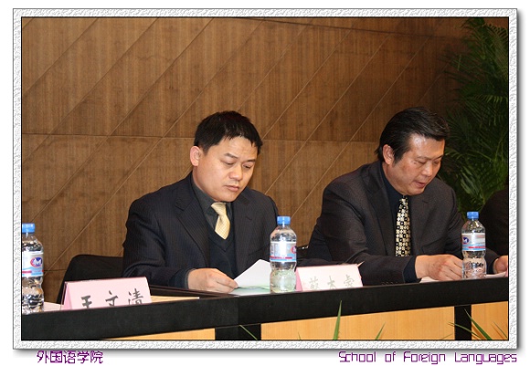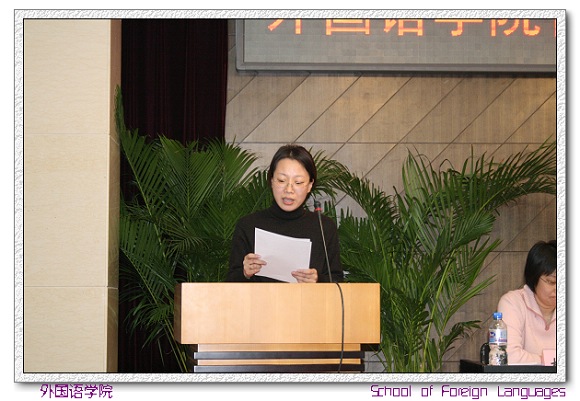 2007年1月24日,外国语学院首届教职工大会暨首届工会会员大会闭幕式在校图书馆一层报告厅举行。校工会常务副主席蔡本睿同志出席了闭幕式,外国语学院党委书记王文清同志,院长吴树敬同志,副院长林彤同志,德语系主任姜爱红同志,外国语言学及应用语言学学科带头人陈大明同志在主席台就坐。学院副书记、副院长吴文君同志,副院长李京廉同志,副院长谭利群同志及大会主席团成员在会场前排就坐,外国语学院全体教职工参加了闭幕式。