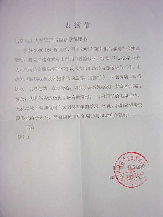 【图】关于管理与经济学院叶琛同学志愿服务的表扬信