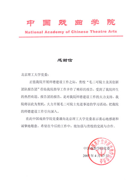 4月17日,我校应邀请在中国戏曲学院举行了“毛二可院士及其创新团队先进事迹报告会”。报告会引起了中国戏曲学院师生的强烈共鸣。会后,中国戏曲学院党委给我校党委发来了感谢信,并希望继续加强两校的合作与交流。