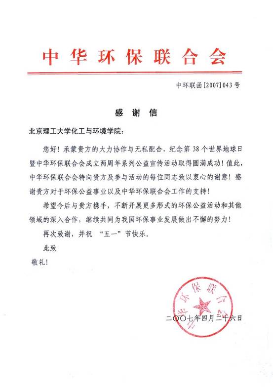 【图】中华环保联合会给化工与环境学院发来感谢信