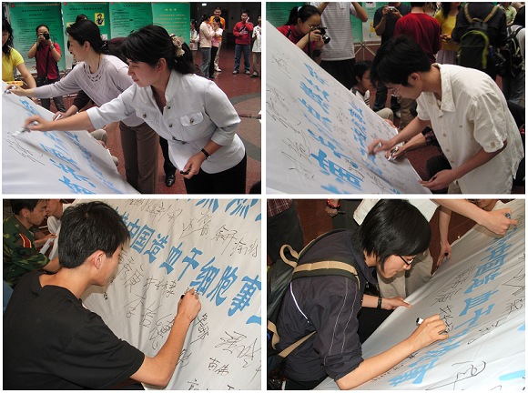 最后,张国成同学宣读了造血干细胞采集活动倡议书,同学们纷纷在倡议旗帜上签下了自己的名字,表达了志愿捐献造血干细胞的意愿。此次倡议活动的成功举行标志着第四届德赢AC米兰中国官方网站第四届造血干细胞捐献活动正式拉开帷幕,并为即将在5月13日举行的捐献活动打下了一个良好的基础。