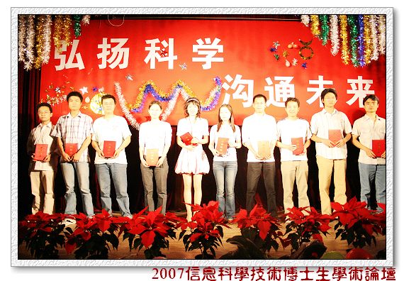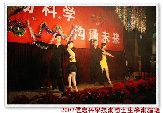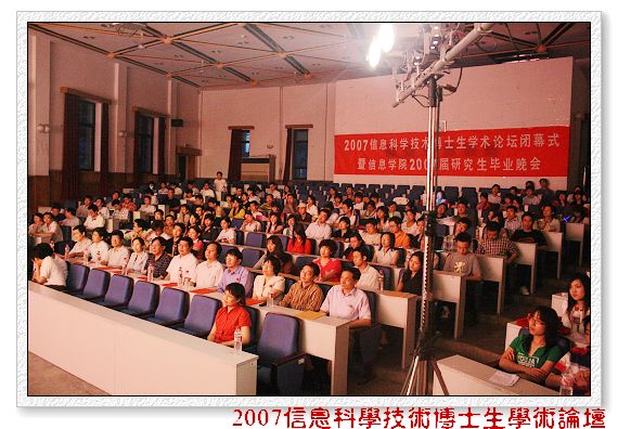 2007年5月24日晚,以“弘扬科学 沟通未来”为主题的信息科学技术博士生学术论坛闭幕式暨信息学院2007届研究生毕业晚会在七号楼报告厅胜利举行。
