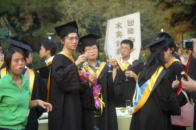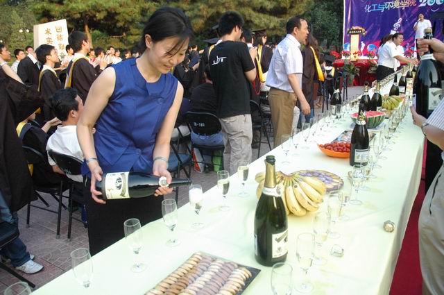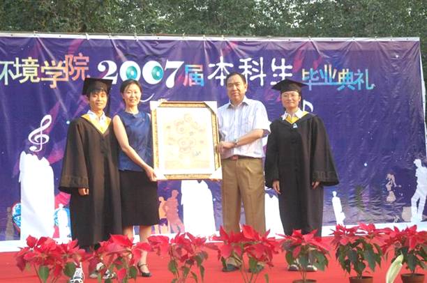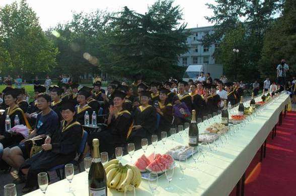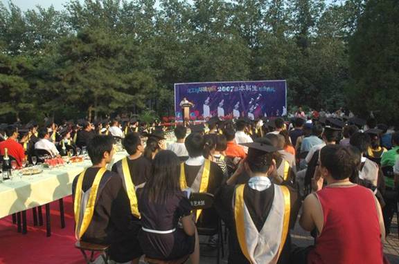 7月11日下午5:30,夕阳西下,化工与环境学院在中心花园隆重召开了2007届本科生毕业典礼。校友会主任杨晖、校团委副书记代方震、保卫处副处长康明应邀参加,学院院领导、各系主任、党支部书记及一线教师、机关教师及学院全体2003届毕业生参加了典礼,学院还邀请了学生家长同同学一起参加毕业庆典,50余名学生家长不远千里从全国各地赶来参加孩子的毕业庆典,毕业典礼借鉴了西方国家的毕业典礼,办成了一个毕业酒会,同学与自己的亲友、恩师一同分享成功的喜悦,并向他们表示了深深的感激,学会了感恩,这也是学院毕业教育的一个重要环节。