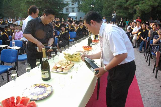 院领导一同开香槟为毕业生庆祝