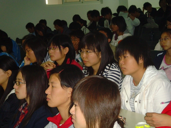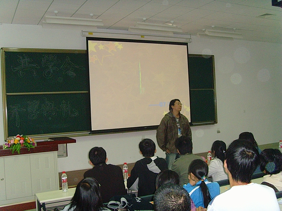 共学会潘俊美主席在跟大一新生以PPT回顾共学会上学期的各项活动和取得的一系列成果,同学们听得很认真。