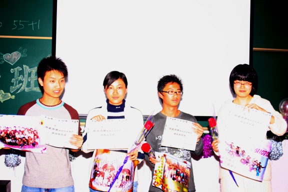 比赛最后,依照当晚比赛分数与前一天的户外比赛分数的总合评选出了最佳人气奖,最佳表现奖,最佳风采奖,最具特色奖,由生命学院辅导员郭惠芝老师颁奖。各班班长的获奖感言将晚会推向又一个高潮。晚会在一片热烈的气氛中落下了帷幕。