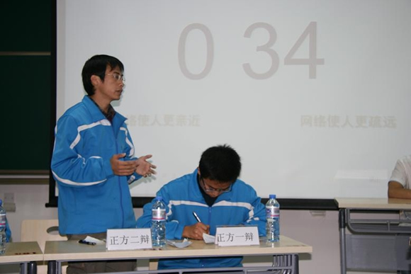 新生辩论赛的决赛,正反双方分别是来自于12110703班和12110702班的选手。正方的观点是网络使人更亲近,反方则主张网络使人更疏远。本次比赛是双方第二次交手,因此比赛尤为激烈。双方辩手唇枪舌剑,互不相让,现场观众的掌声也是一次高过一次。经过了近一小时的辩论,最终正方3班击败反方,获得冠军。