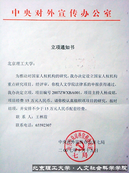 “国家人权机构研究”(项目编号:2007ZYWXBA001)是中央外宣办2007年重点课题,科研经费15万元(专著出版费用另计),该课题旨在深入研究各国的国家人权机构的组织机构、工作流程以及联合国人权高专对其相关认证,为我国成立相关的国家人权机构,更好的实现人权保护提供理论的依据与建议,为“人权入宪”现实的保障与运作提供相关理论支持。