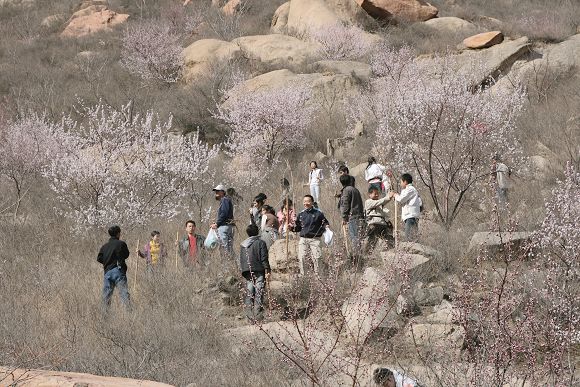 在领取了火炬树苗以及种植工具后,同学们迈开青春的步伐来到山间,初春的北京虽然还有一丝寒意,但同学们始终热情饱满,欢声笑语。