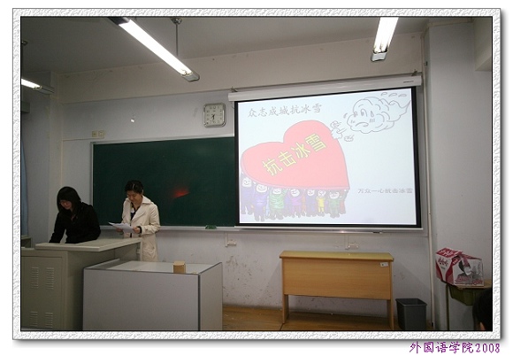 05级德语系曹舒悦和陈佳丽同学以《众志成城抗冰雪》为题深情讲述了抗雪救灾过程中发生的感人至深的故事,用一幅幅鲜活的图片再现了受灾情况和救灾情况,生动体现了我党“情为民所系,权为民所用,利为民所谋”的全心全意为人民服务的精神,展现了救灾过程中共产党员身先士卒的精神风貌。她们指出,青年党员应努力学习,全面提高自身综合素质,积极为国家和人民做贡献,做人民的公仆。