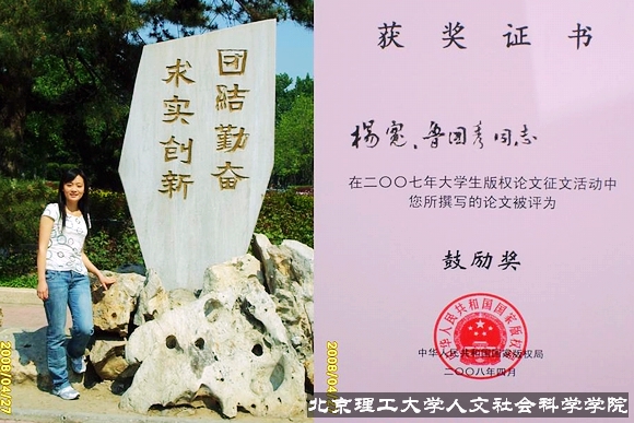 由于对专业的喜爱,我积极参与了相关的各项学术活动。在过程中我感受到了专业理论研究的博大精深,也收获了许多经验和荣誉。2007年下半年,撰写了论文 《浅论网络服务提供者的责任问题》,这篇文章在《德赢AC米兰中国官方网站学报》(社会科学版)2008年第2期发表。2008年4月,我所写的《网络服务提供者的责任问题简析》一文获得中国国家版权局主办的“全国大学生版权论文征文活动”三等奖,并收录在《青春与版权同行》论文集中。此外我还参与了两个法学领域课题小组的研究活动,一个是中国人民大学中欧法学研究项目“有限责任公司小股东退出机制”的课题研究,并预计发表论文1篇。另一个是德赢AC米兰中国官方网站国家大学生创新性试验计划项目“我国农村土地承包经营权的流转和创新”,我们结合实地调查得出的数据,通过撰写论文的形式归纳了我们的调查研究结果。