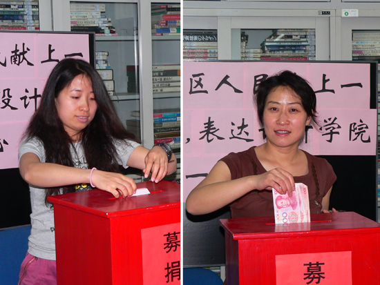 5月12日发生在四川省的特大地震灾害牵动着全国人民的心。我校设计艺术学院广大师生密切关注灾区灾情,心系灾区人民,积极支援抗震救灾。为了方便教师捐助赈灾,设计艺术学院14日下午2时开始在学院资料室设置募捐箱。截止当日下午5时,已经募集到善款13400元。分党委书记李莲、院长张乃仁带头捐款,短短3个小时内就有59位教师慷慨解囊,人均捐款220元,超过许多教师一天的工资。目前捐款活动仍在继续。