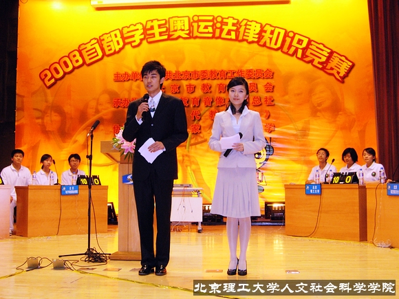 2008年5月31日下午两点,2008首都学生奥运法律知识竞赛大学组决赛在史家小学礼堂隆重举行,我校党委宣传部部长贺亚兰、人文学院党委书记张剑军、人文学院副书记副院长贾利军亲临比赛现场加油助威。人文学院05级法学专业杨宽、李艳丽、鲁国秀三名同学代表我校出赛,同北京航空航天大学、北京第二外国语学校等五所高校代表队一起,开始了激烈角逐。代表队最终不负重望,获得二等奖的好成绩。奥运法律知识竞赛在由人文学院2006级40名同学组成的啦啦队喊出的响亮口号——“法治中国,和谐奥运,激情北理,青春飞扬”中开拉了序幕。经过一个月的紧张备战,杨宽、李艳丽、鲁国秀三名同学在赛场上信心十足,在必答题、抢答题、风险题三个环节中沉着冷静、团结合作,从容应对多变的赛场形势,他们的精彩表现赢得了全场观众的热烈掌声,并终以优异成绩获得二等奖。