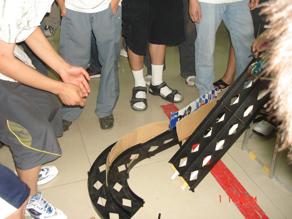 最后,精彩激烈的跑道赛开始了。跑道赛定为10圈,中间允许更换电池,但计时间。若速度太快冲出跑道,时间暂停,都由此带来的时间误差及车子损坏由参赛选手自负。比赛中,只见每辆四驱车在跑道中疾驰,不禁让人担心车子会飞出跑道。果然,当跑到最后几圈时,有的车子就一下冲出跑道,或者因速度太快造成马达受损和轮胎脱落。如此看来,还真有点F1的味道。但选手们毫不气馁,迅速作出调整来完成剩余比赛。