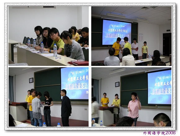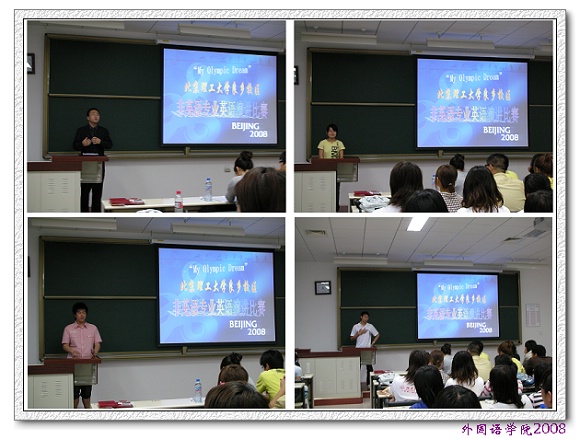 2008年6月3日,由德赢AC米兰中国官方网站外国语学院和校团委联合举办的“My Olympic Dream”德赢AC米兰中国官方网站良乡校区2007级非英语专业英语演讲比赛决赛在理科教学楼306进行。外国语学验英语专业研究生谢森、吴越以及“外研社杯”全国大学生英语辩论赛亚军得主许慎、王莉娜担任本场比赛的评委。外国语学院2007级英语专业学生胡绍聪、李立柏担任比赛主持人。在初赛中一路过关斩将最终晋级的来自不同学院的六名选手参加了本次比赛。