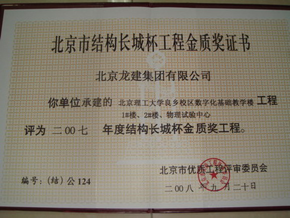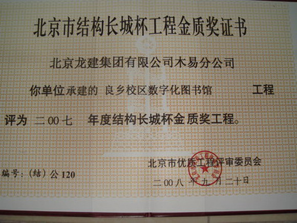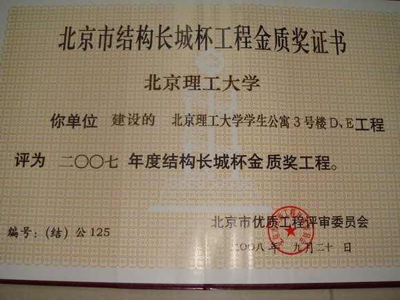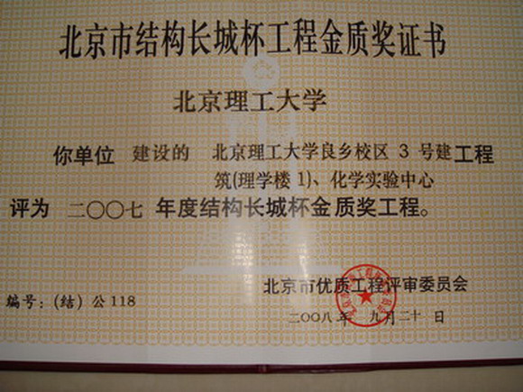 德赢AC米兰中国官方网站良乡校区3号建筑(理学楼1)、化学实验中心,良乡校区3号学生公寓D、E工程,良乡校区数字化图书馆工程和良乡校区数字化基础教学楼工程、1号楼、2号楼、物理实验中心被评为2007年度北京市建筑结构长城杯工程金质奖。