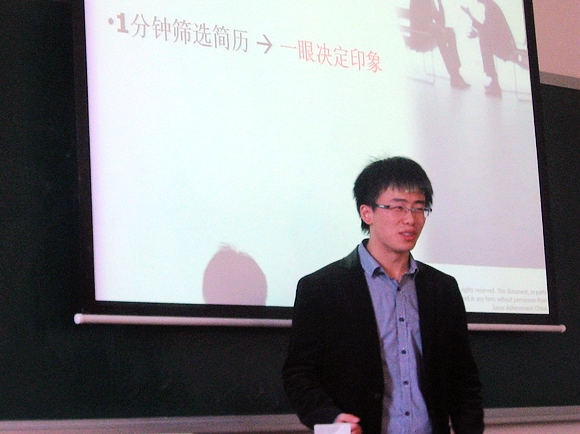 这次课程的第一位主讲人是来自毕业于我们的兄弟院校——北京航空航天大学,先就职于VMWARE的志愿者刘亢同学。人如其名,刘亢同学相当的亢奋,现场气氛也很活跃。他本人是有着相当多的参与面试的经验的。所以在课程中,他给我们讲了许多自己的经历,失败的、成功的都有。归结起来,有一条很重要,就是在面试时不要随便受面试官的表情影响,同时在面试时一定要真诚,只有让你觉得很自然很舒服的工作,才是真正适合你的工作。