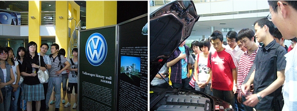 在抵达一汽大众京内最大的4s店之后,一汽大众汽车有限公司的人力资源部负责人王先生先介绍了此次活动的流程,随后由经销商德奥达公司曲经理为大家介绍企业品牌、经销商情况。之后,由该公司明星销售经理贾先生带领学生,逐一讲解奥迪展厅每一辆奥迪汽车的性能、工艺、技术等,并且一一回答学生提出的问题。在领略了高级轿车的风采之后,大家参观了汽修车间、二手车公司,步入经济型轿车的展厅,在该展厅内讲解员详细讲解了一汽大众的历史、品牌文化,大家兴致勃勃地感受了速腾、迈腾等一系列大众品牌经济型轿车的室内空间等。