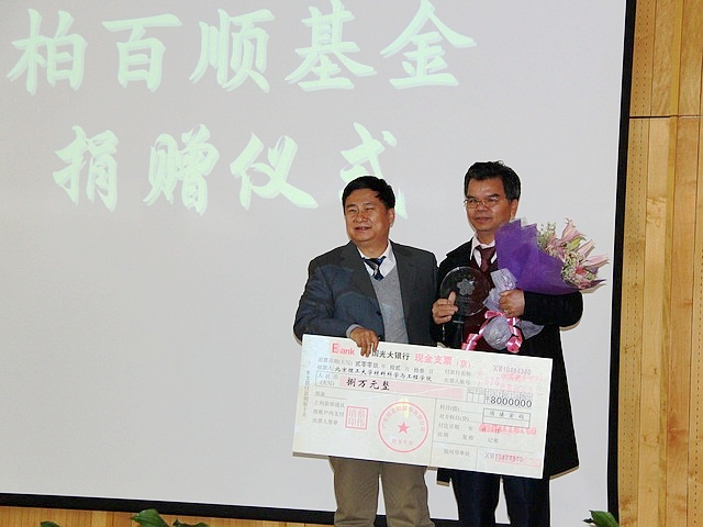 首先进行的是柏百顺基金捐赠仪式,由柏百顺公司董事长蔡伟清先生与材料学院院长邹炳锁互赠支票和礼物。东莞市柏百顺石油化工有限公司作为国内从事石油化工的知名企业,事业蓬勃发展的同时不忘心系教育事业,连续六年来在材料学院设立教育基金,奖励优秀的青年教师和全面发展的优秀学生,到目前为止该公司已经向我院赞助奖金共计45万元。