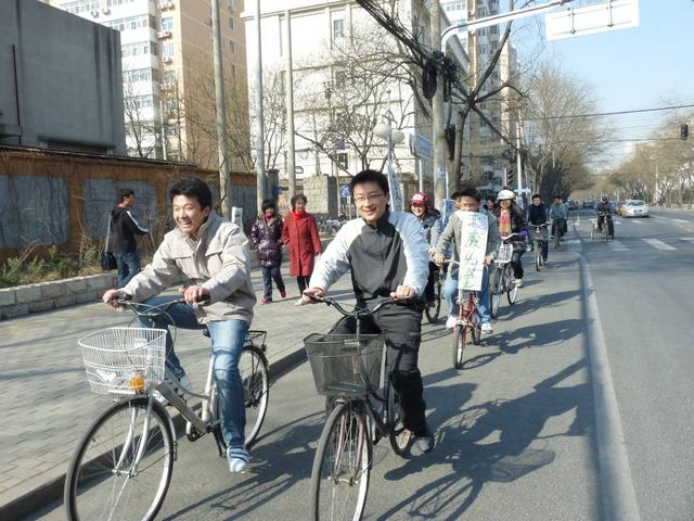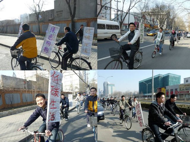 当“出发”的指令响起,本次活动正式拉开了序幕。三十一辆自行车,三十一面旗帜,承载着一个集体“绿色社会”的美好愿念,承载着当代中国青年“家国天下”的社会责任感,驶向前方。宁静的校园里陡添了几许勃勃生气,繁华的街区徒增了一道亮丽的风景。从学校南门到紫竹院,从白石桥到为公桥,从新中关购物中心到学校东门,两个多小时的行程里大家不曾有片刻的停歇,即使在等待红绿灯时,也不忘向周边好奇的群众解释什么是“低碳生活”。