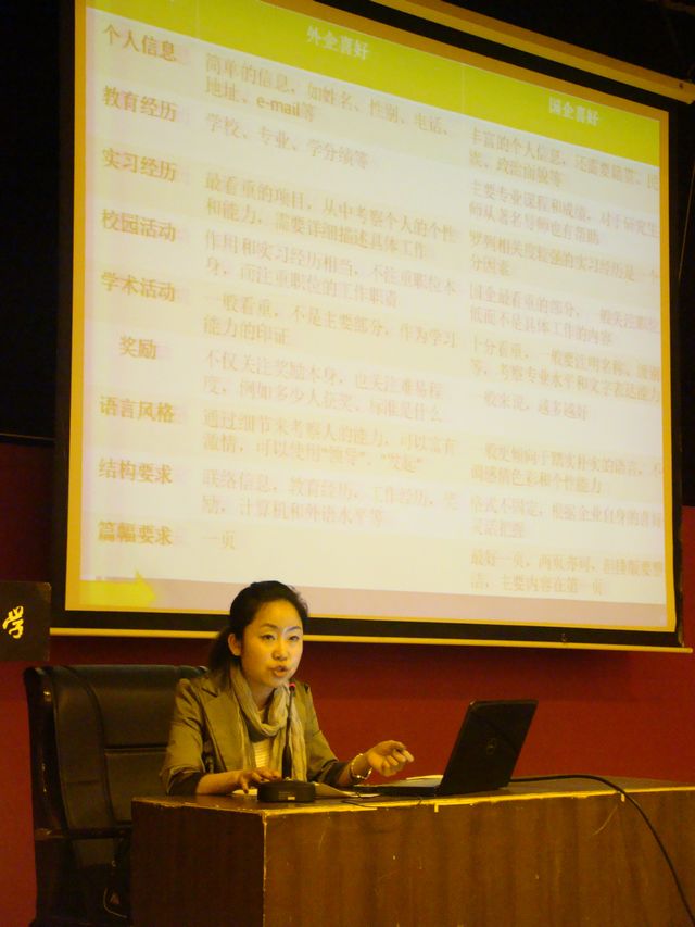 本课程由机械与车辆学院教育教学办公室、分团委牵头组成课程组开设了职业发展规划系列专题讲座,主要面向对象为机械与车辆学院2011年毕业生。此次讲座旨在使学生将个人的职业发展与专业学习、社会实践等培养内容结合起来,树立大学期间的阶段性目标,并结合自己的实际情况进行有目标性的努力。