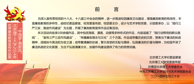 为认真学习贯彻党的十八大、十八届二中、三中全会精神,进一步加强作风建设,营造浓厚的廉政文化氛围,由我校纪委监察室、党委宣传部、校团委主办,设计与艺术学院党委、分团委承办,开展的以“践行三严三实,推进作风建设”为主题的廉政教育宣传作品征集活动已取得了丰硕的成果。于2014年5月30日——6月6日在中观村校区中心教学楼一层大厅举办优秀作品展,欢迎各位老师、同学前往参观。