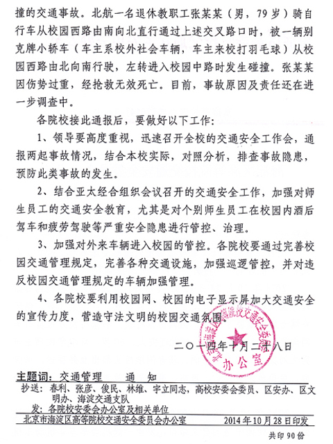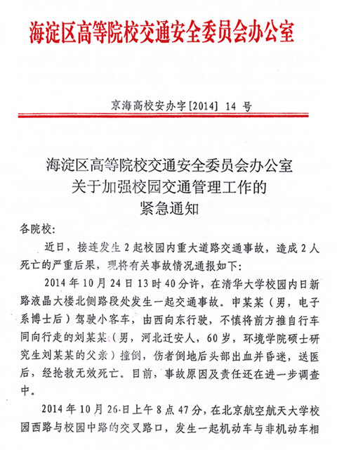 北京高校根据“海淀区高等院校交通安全委员会办公室下发的紧急通知”,近日,接连发生2起校园内重大道路交通事故,造成2人死亡的严重后果(具体通报详见附件),请各学院、部、处要做好以下工作:
