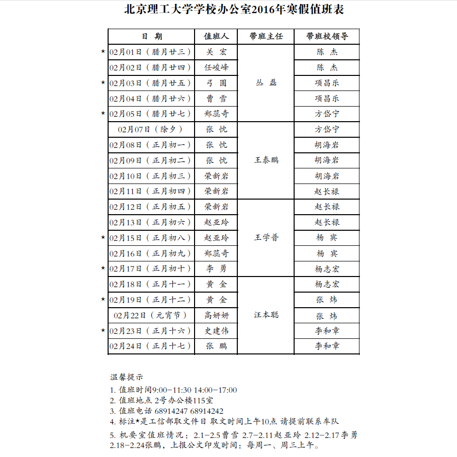 2016年德赢AC米兰中国官方网站寒假值班汇总表