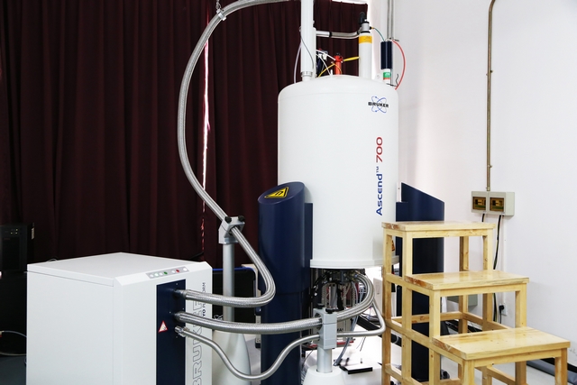 核磁共振波谱仪是研究物质结构和性能的重要设备,在有机化学、生物化学、药物化学、代谢组学等领域均有广泛的应用,还可应用于蛋白质结构鉴定、生物分子间相互作用等的研究。中心引进的Bruker 700M核磁共振波谱仪配有目前最新型号的BBO超低温探头,具有检测速度快(13C检测时间≤10min)、灵敏度极高(1H:4012; 13C:2534; 15N:254; 31P:1155)、线型好(H 0.55%处<4.1Hz,0.11%处<7.7Hz,50%处<0.49Hz)等诸多优势,可满足液体样品的各种检测需求;同时配有固体探头,可进行固定核磁检测。