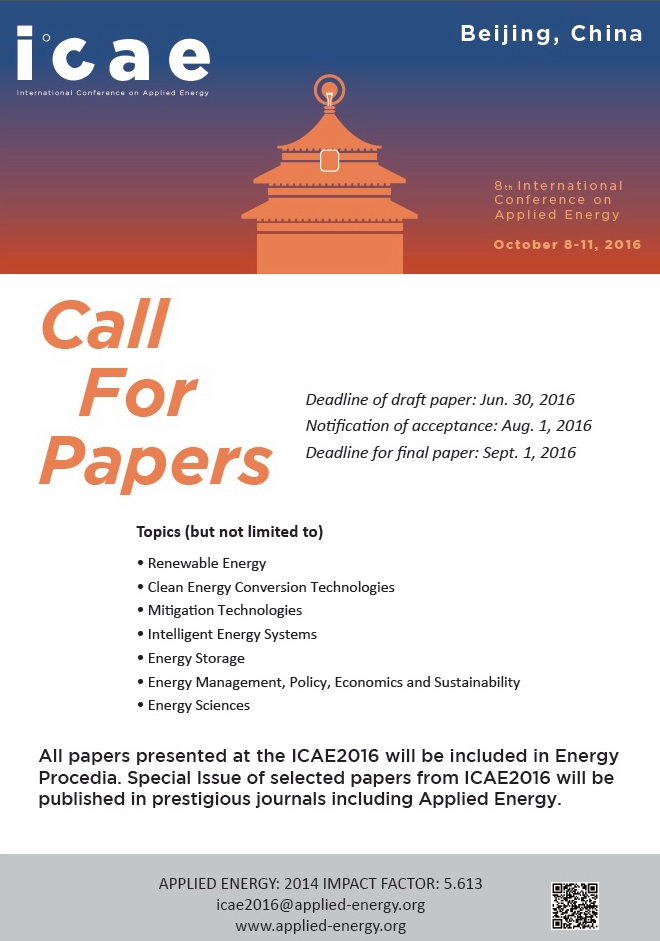 本届会议拟征集反映本领域最新研究成果及原创方法的论文,投稿论文必须用英文撰写,录用文章的作者需要到参会现场交流。本届会议接收的论文将由Elsevier出版社旗下Energy Procedia出版,并遴选优秀论文推荐至Applied Energy源刊发表。所有稿件均由相关领域的专家从原创性、重要性、写作质量角度进行评审。