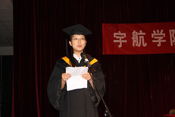 毕业生代表齐慧慧代表09届毕业生发言,她代表所有毕业生向母校表达了深深的情意,“祝福我们的母校,我们的宇航,永铸辉煌!”