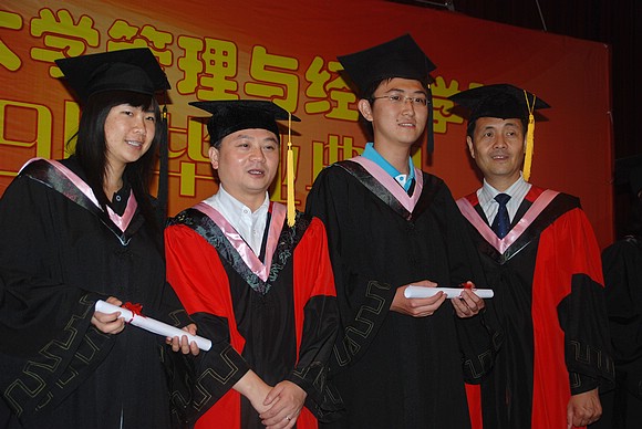 毕业典礼后,魏一鸣教授、李金林教授、韩伯棠教授、李健教授、何海燕教授、孔昭君教授为毕业生授予学位并合影。