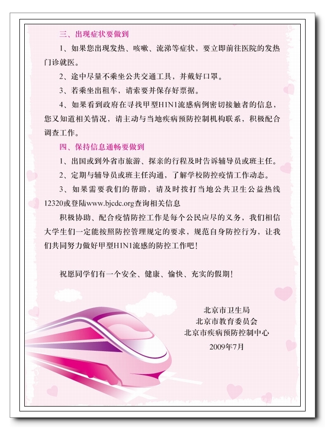 暑假临近,为保证学生的身体健康,做好全社会甲型H1N1流感的防控工作,市卫生局、市教委、市疾病预防控制中心联合印制了“致大学生的一封公开信”,提醒学生在假期活动中应采取有效的防控措施。