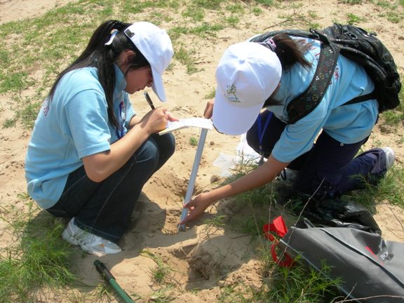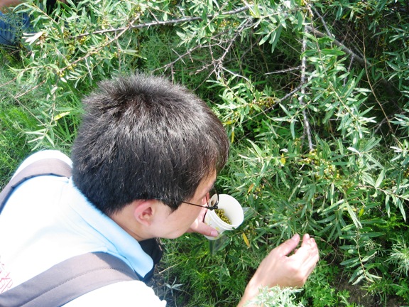 中午简单的进餐休息过后,科考队员们按照不同的调研目的、调研对象及调研地点分为两组开始了更进一步的考察。陈苗和王韧同学在村民的带领下,前往塔敏查干沙漠沙棘生长繁茂地点,采集植物样本,陈苗同学还在随队指导老师的指导下,掘取沙棘生长和无沙棘土壤用于含水量测定和微生物研究,通过对植物和其生长环境的对比研究,可以对沙棘之于土质改善生态的作用和原理进行研究,并将研究结果运用到实际中去;王韧同学的考察重点是沙棘果实的药用价值及其作为中草药重要组分的确切起效成分分析,提高对沙生植物的科学开发和利用。