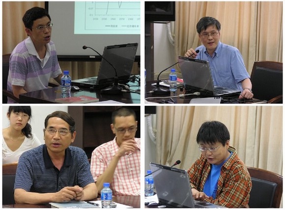 研讨会上国外学者:美国犹他大学经济系李民骐博士(左上)做了题为《从世界历史角度看全球资本主义经济危机》,英国伦敦大学卢荻教授(右上)做了题为《中国发展模式与全球经济危机》的学术报告;国内学者:中国人民大学方福前教授(左下)做了题为《中国发展模式与全球经济危机》,清华大学赵准副教授(右下)做了题为《对全球金融危机的马克思主义分析》的学术报告。