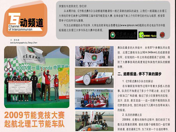 2008年,在整车的制作过程中,我们经历了无数无法想象的困难:曾经无数个夜晚我们一直忙碌到凌晨,甚至通宵工作;为了买到一个合适的零件,我们一天骑车跑遍西四、木樨地、辛庄的五金店;为了能够顺利完成并提高成绩,我们都选择在酷热的暑假留校;为了在更合适的场地试车,我们连续一周坐公交往返于良乡和中关村校区,每天花在公交上的时间就不下五个小时……08年已经过去,09年才是我们新的机遇和挑战,今年车队的目标是达到1200km/L经过了前期的理论知识培训和学习、方案设计选拔,我们每一个人都明确了自己的任务,马上进入下一阶段实际制作,通过不断地自我挑战,我们相信一定可以触摸到梦想的光环!《方程式赛车》杂志希望通过与青檬网络电台联合报道“节能竞技大赛”,共同呼吁全社会共同努力,注重环保,为中国建设节约型社会贡献微薄之力。我们期待2009年9月他们在上海再创辉煌。