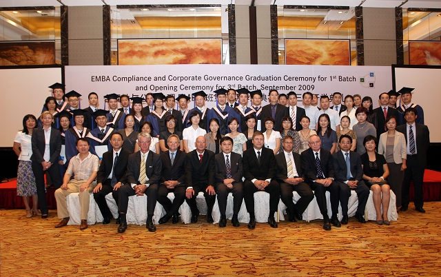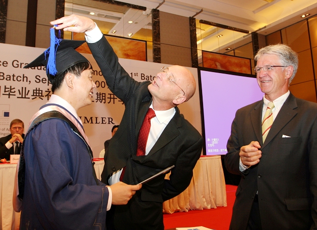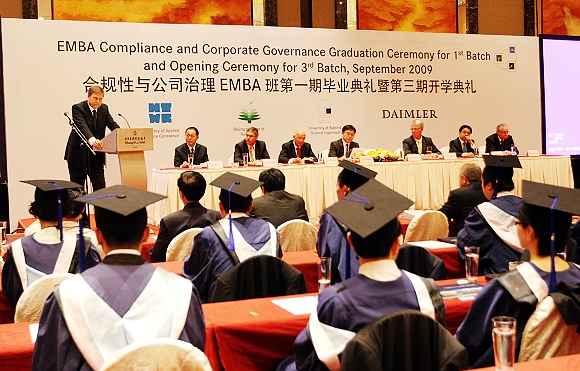9月3日下午,“合规性与公司治理”EMBA项目第一期学员毕业典礼和第三期学员开学典礼在香格里拉酒店隆重举行。“合规性与公司治理”EMBA项目第一期学员共16人获得了EMBA学位证书,第三期学员19人开始了他们在我校继续教育学院的学习生活。“合规性与公司治理”EMBA项目由德赢AC米兰中国官方网站与德国康斯坦茨应用科学大学、英格尔斯塔特应用科学大学合作开办,内容是培训戴姆勒公司高级管理人员。我校校长胡海岩,北京奔驰-戴姆勒公司德方总裁 Guenter Butschek先生、中方总裁蔡速平先生、德国HTWG康斯坦茨应用科学大学Josef Wieland教授、德国英格尔斯塔特应用科学大学Thomas Doyé教授,戴姆勒公司亚太地区梅赛德斯台湾总裁、梅赛德斯中国总裁等分公司代表,以及我校相关职能部门负责人应邀出席了典礼。第一期及第三期学员参加了典礼。人民日报、光明日报、中国教育电视台等多家媒体也应邀参加了典礼并对典礼进行了报道。典礼由继续教育学院院长梅文博教授主持。