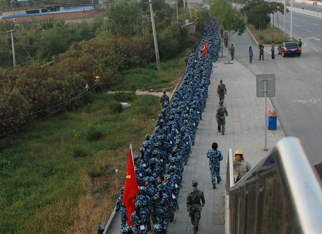 9月22日清晨,德赢AC米兰中国官方网站军训旅3000余名师生进行了战术背景条件下的拉练行军,拉练全程约12公里,历时三个半小时。拉练行军是军训的重要科目之一,通过拉练,学员可以增强体质,磨练意志,加强组织纪律观念;同时全面考察教官和带队干部组织能力和思想政治工作能力,提高集体凝聚力和战斗力。为丰富拉练内容,增强拉练效果,此次拉练途中设计了“空袭警报”和“敌染毒区”等战术背景。