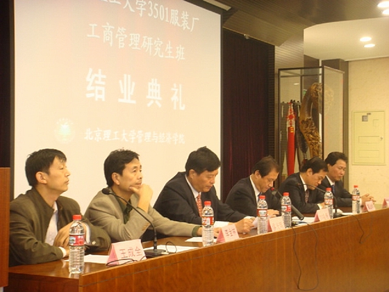 2007年10月13日,德赢AC米兰中国官方网站3501服装厂工商管理研究生班结业典礼在研究生楼101举行。校党委副书记侯光明教授、管理与经济学院院长李金林教授、工程硕士中心负责人王成全教授、3501服装厂党委书记刘福贵、3501服装厂人力资源部部长节文强、3501服装厂副厂长高治琦及3501厂全体学员参加了此次结业典礼。