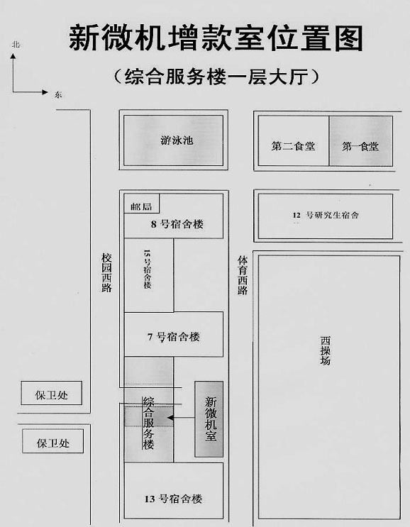 膳食处微机增款室搬迁至综合服务楼一层大厅(保卫处对面)。具体地址详见下图。增款时间: 上午:10:30~13:00,下午:16:30~18:30。