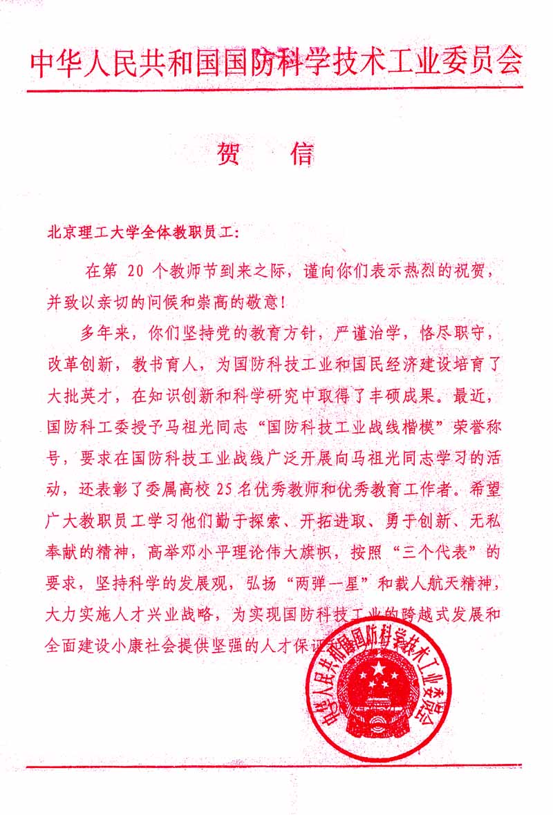 中华人民共和国国防科学技术工业委员会贺信