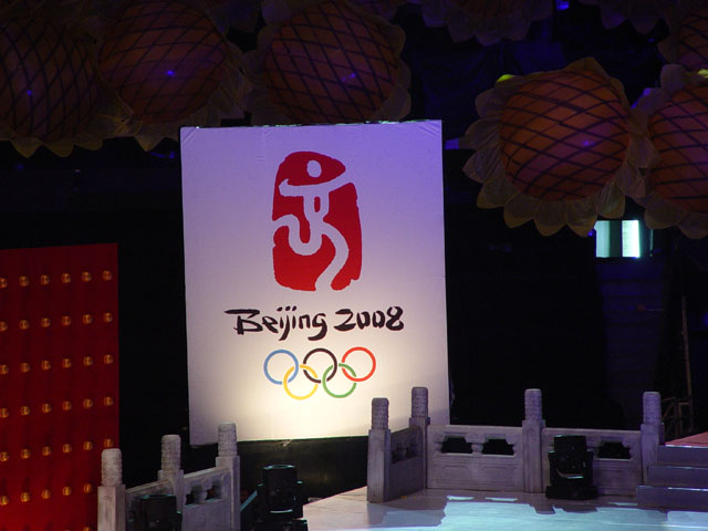 北京2008年奥运会主题口号发布仪式6月26日晚在北京工人体育馆隆重举行。夜晚的北京沉浸在节日的喜庆气氛里,,万众瞩目这一激动人心的时刻。