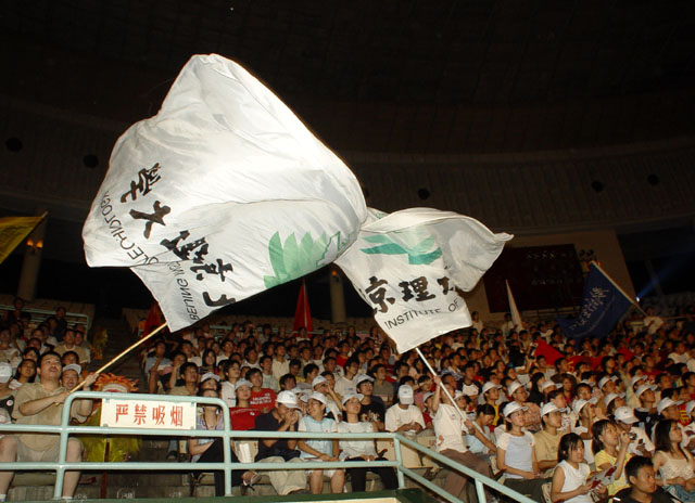 我校近200名师生和来自其他首都高校的师生、各界人士共同在现场体验了这一激情时刻,口号宣传歌曲的悠扬旋律回荡在体育馆大厅内。