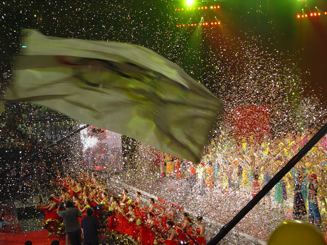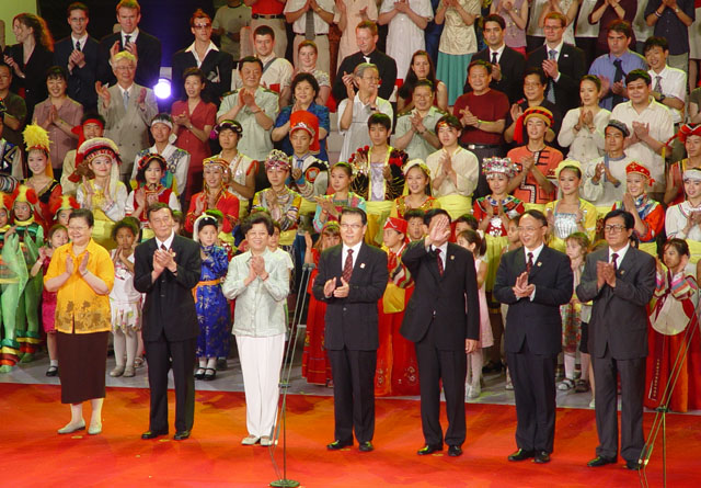 20时15分,在全场来宾的热切期盼中,李长春宣布北京2008年奥运会主题口号:“同一个世界,同一个梦想”。话音刚落,全场掌声雷动,覆盖在主题口号上的朵朵向日葵缓缓升空,“同一个世界,同一个梦想”(One world,One dream)呈现在世人眼前。