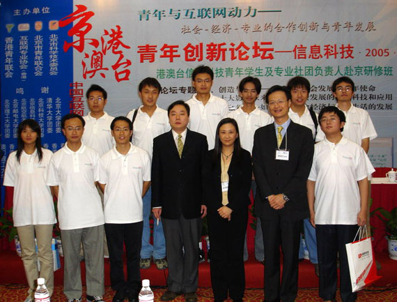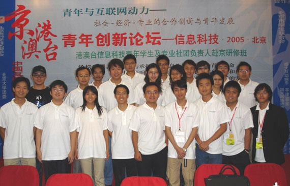 日前,由北京市科委、北京市青联、香港互联网专业协会和香港青年联合会共同发起并主办的首届“京港澳台青年创新论坛—信息科技·2005·北京”在北京国际会议中心隆重举行。北京市团市委书记关成华致开幕词,国家科技部副部长马颂德就“政策与发展”作了主题演讲。清华、北大、理工、北邮等重点高校应邀参加此次论坛,和来自港澳台的高校学生作主题交流。我校派出由计算机科学技术学院、软件学院丁刚毅副院长和院团委余海滨带队,十名学生代表参加的代表团。