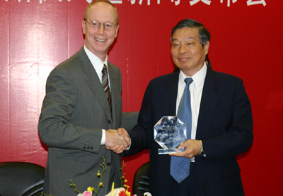 国防科工委副主任张华祝与PTC公司首席执行官哈瑞森先生互赠礼物