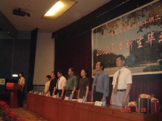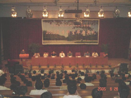 2005年6月26日上午八点三十分,机械与车辆工程学院2005届本科生毕业典礼在我校中心教学楼一层报告厅在庄严肃穆的国歌声中拉开了帷幕。虽然由于天气原因,未能按计划在东操场进行,但现场气氛还是非常热烈,到会的有学院领导、教师代表、300多名即将毕业的本科生以及远道而来的部分学生家长。大家一起见证这激动人心的历史时刻。